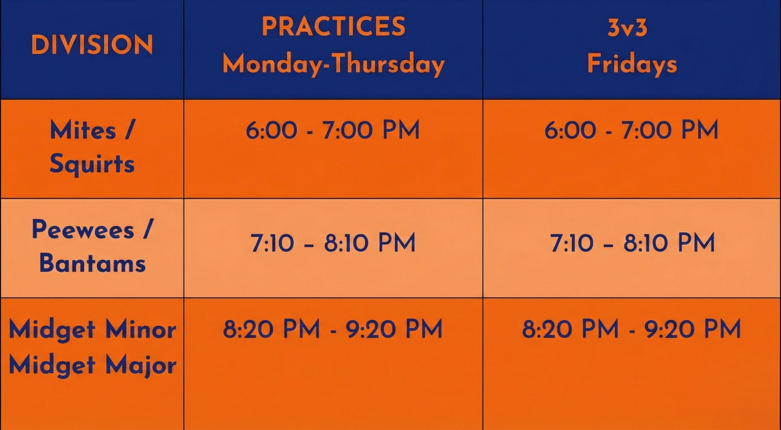 Two practices: Each age division will have two sixty-minute training sessions per week.